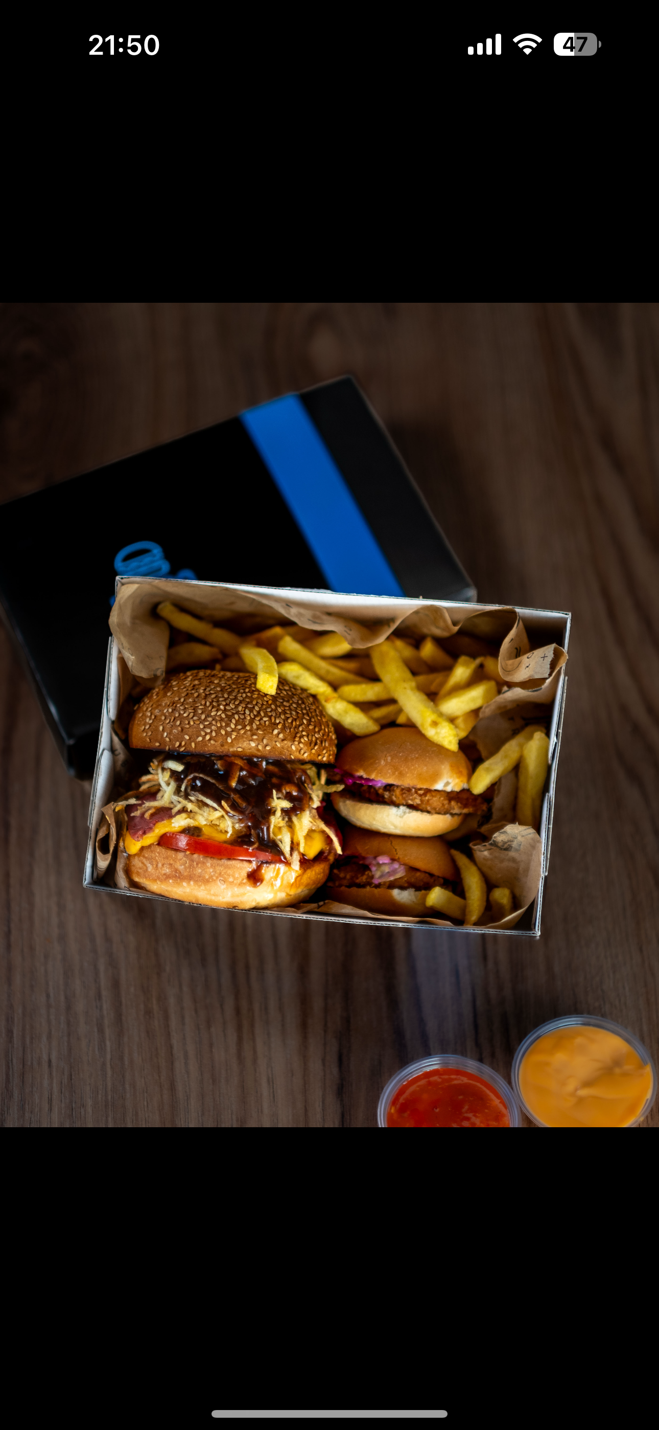 Burger Ekmeği,160gr köfte, 4adet cheddar, hardal, ketçap,turşu, soğan, 2 adet mini tavuklu Burger ve patates i...